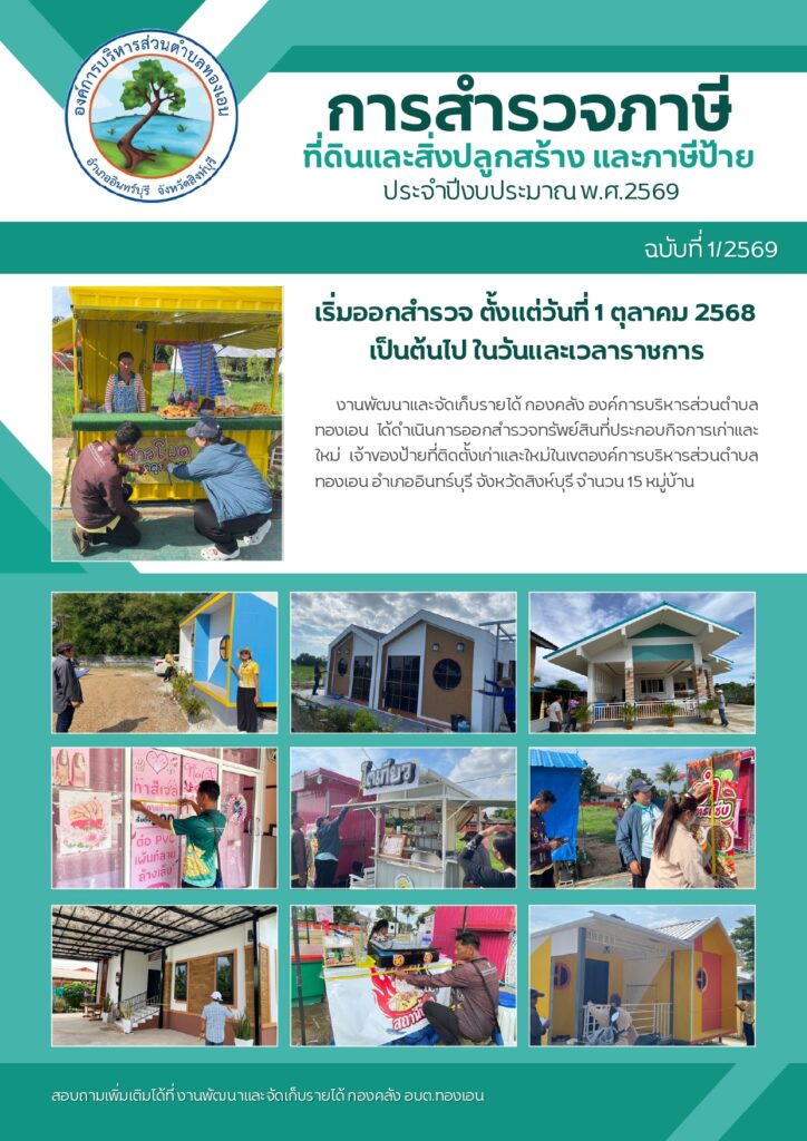 งานพัฒนาและจัดเก็บรายได้ กองคลัง องค์การบริหารส่วนตำบลทองเอน ได้ดำเนินการออกสำรวจทรัพย์สินที่ประกอบกิจการเก่าและใหม่ เจ้าของป้ายที่ติดตั้งเก่าและใหม่ในเขตองค์การบริหารส่วนตำบลทองเอน อำเภออินทร์บุรี จังหวัดสิงห์บุรี จำนวน 15 หมู่บ้าน โดยเริ่มสำรวจตั้งแต่วันที่ 1 – 22 ตุลาคม 2568 ในวันและเวลาราชการ บัดนี้ได้สิ้นสุดระยะเวลาในการสำรวจแล้ว หากมีข้อสงสัยประการใด สามารถติดต่อสอบถามได้ที่ งานพัฒนาและจัดเก็บรายได้ กองคลัง องค์การบริหารส่วนตำบลทองเอน หรือติดต่อเบอร์โทร. 036-811567