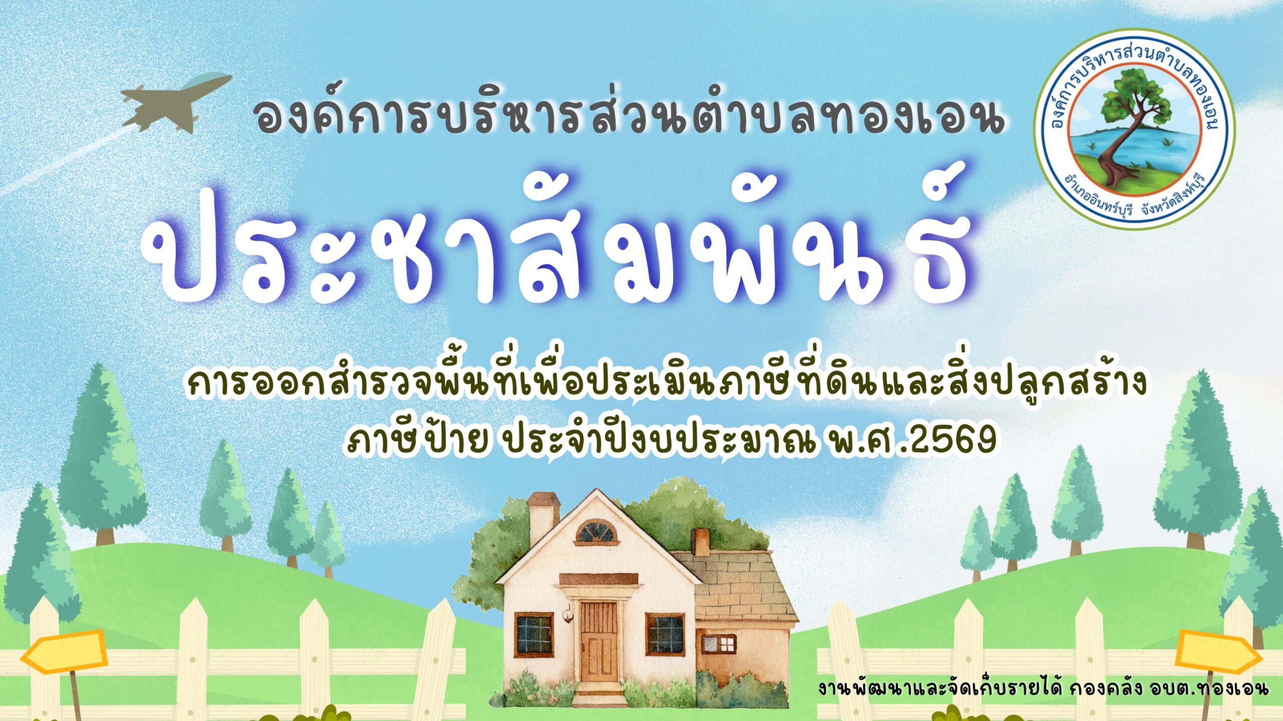 องค์การบริหารส่วนตำบลทองเอน ขอแจ้งเกี่ยวกับการออกสำรวจพื้นที่ในเขตตำบลทองเอน และแจ้งการสำรวจข้อมูลภาษีที่ดินและสิ่งปลูกสร้าง และภาษีป้าย เพื่อใช้ในการจัดเก็บภาษีที่ดินและสิ่งปลูกสร้าง และภาษีป้าย ประจำปีงบประมาณ พ.ศ.2569