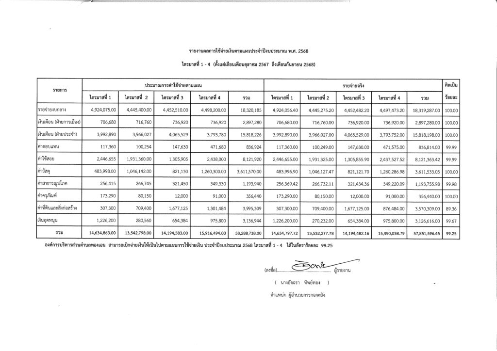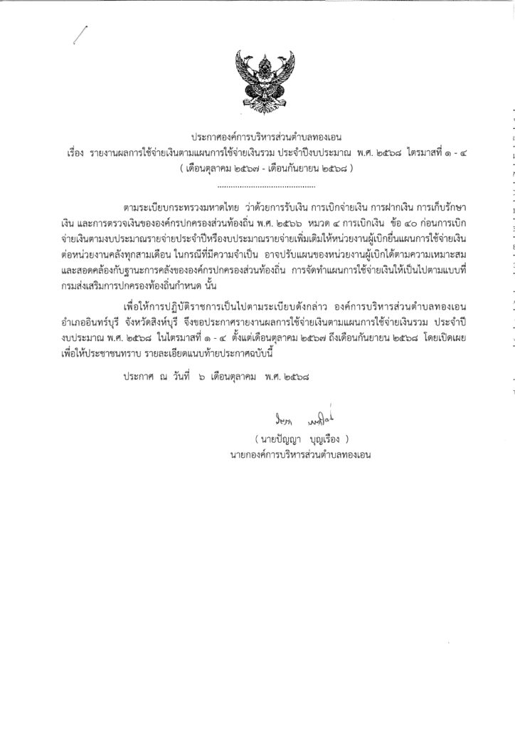 FacebookLine เมนูนำทาง เรื่อง ประกาศองค์การบริหารส่วนตำบลทองเอน เรื่อง รายงานผลการใช้จ่ายเงินตามแผนการใช้จ่ายเงินรวม ประจำปีงบประมาณ พ.ศ.2568 ไตรมาสที่ 4 (เดือนกรกฎาคม 2568 – เดือนกันยายน 2568) ประกาศองค์การบริหารส่วนตำบลทองเอน เรื่องรายงานงบแสดงผลการดำเนินงานที่จ่ายจากเงินรายรับตามแผนงานรวม ประจำปีงบประมาณ พ.ศ.2568 ไตรมาสที่ 4